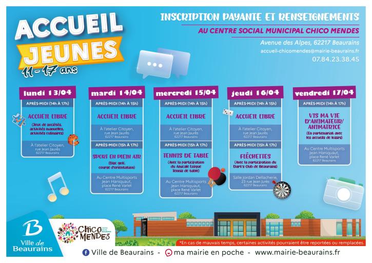 INSCRIPTIONS EN COURS au Accueils de Loisirs de fin d’année.Beaurinois - Du lundi 09 mars au dimanche 29 mars 2026.Extérieurs - Du lundi 23 mars au dimanche 29 mars 2026.