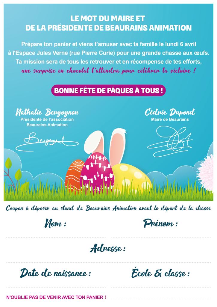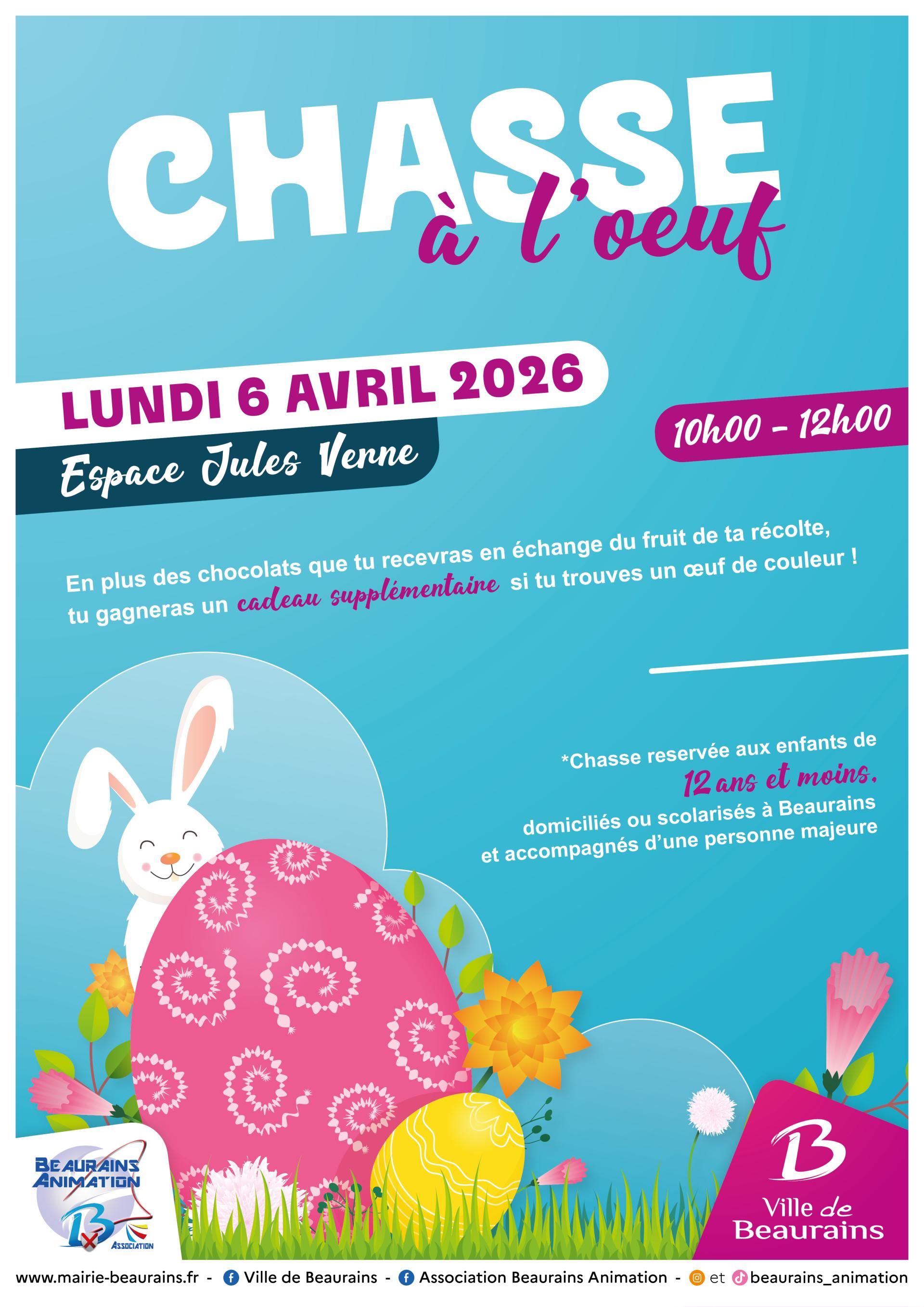 Prépare ton panier et viens t’amuser avec ta famille le lundi 6 avril à l'Espace Jules Verne (rue Pierre Curie) pour une grande chasse aux œufs.