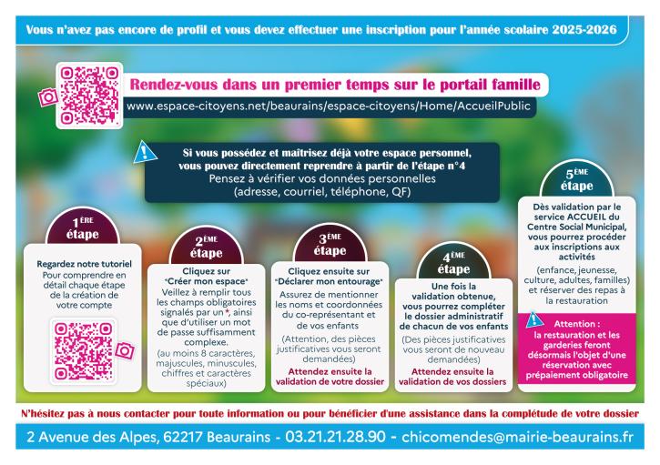 Pour inscrire votre enfant, il vous faudra votre espace personnel (si ce n'est pas déjà fait) sur : https://www.espace-citoyens.net/beaurains/espace-citoyens/